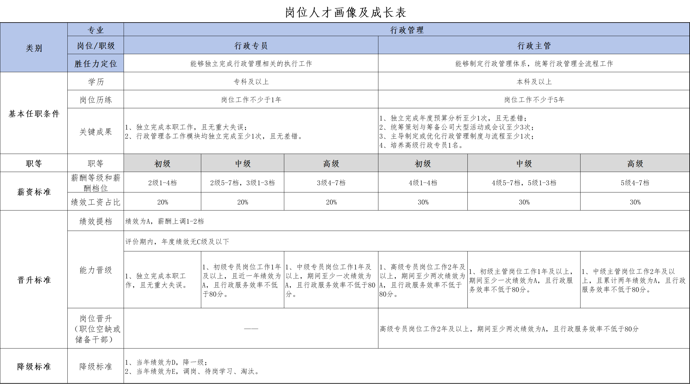 2、設(shè)計開發(fā)《員工畫像及成長表》各對崗位不同層級的角色定位、晉升和降級標準、考核指標、薪酬待遇范圍等,方案簡潔清晰,“一站式”解決部門對員工評價標準和成長激勵的問題。