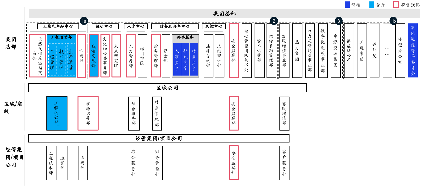 2021年11月起,公司聘請麥肯錫咨詢公司協(xié)助完成了公司管理變革方案的設(shè)計,重點在“組織架構(gòu)和職能優(yōu)化、分級授權(quán)和決策流程優(yōu)化、考核激勵機制優(yōu)化”方面。本次方案提出了“精簡總部、做實區(qū)域公司和新業(yè)務(wù)集團(一級組織)”的主張,在項目公司之上,有條件地增設(shè)了經(jīng)營集團,以縮小管理幅度、加強管控力度,形成了事實上的四級管控;同時,通過“兩級閉環(huán)”的設(shè)計邏輯,實現(xiàn)了管理權(quán)限的層層釋放,實現(xiàn)了部分核心職責(zé)的下移和前移。目前,上述管理變革方案已設(shè)計完成,部分已推動落地。