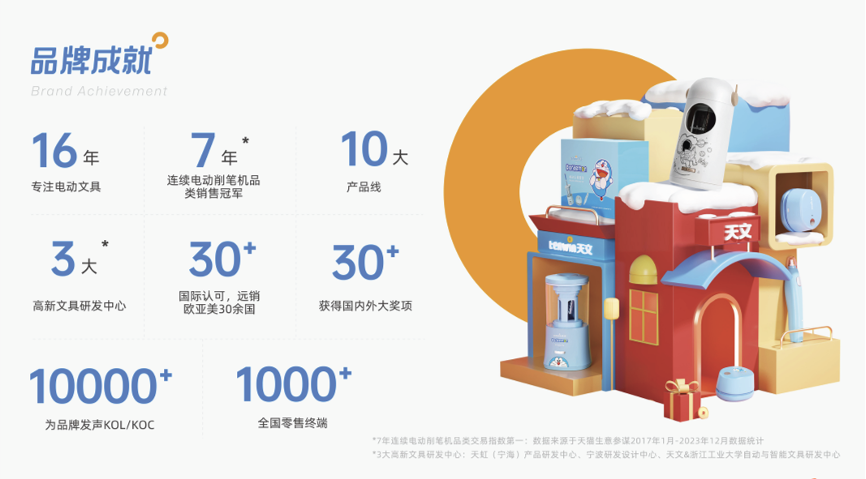 擁有“天文”(tenwin)品牌的寧波天虹文具有限公司創(chuàng)建于1989年,擁有員工2000多人,是一家具備完整產(chǎn)業(yè)鏈和多元化產(chǎn)品線的現(xiàn)代企業(yè)集團(tuán),旗下“天文”品牌十余年專(zhuān)注于自動(dòng)與智能文具的研發(fā)與制造,擁有電動(dòng)削筆機(jī)、自動(dòng)文具、矯姿用品、包袋用品、創(chuàng)意益智、習(xí)慣養(yǎng)成、美術(shù)用品、電動(dòng)文具套裝八大產(chǎn)品線,致力于成為自動(dòng)文具領(lǐng)域的先鋒,讓每一個(gè)消費(fèi)者都能享受到簡(jiǎn)單易用、省時(shí)省力、優(yōu)品美感、優(yōu)越體驗(yàn)的新一代智能文具產(chǎn)品。