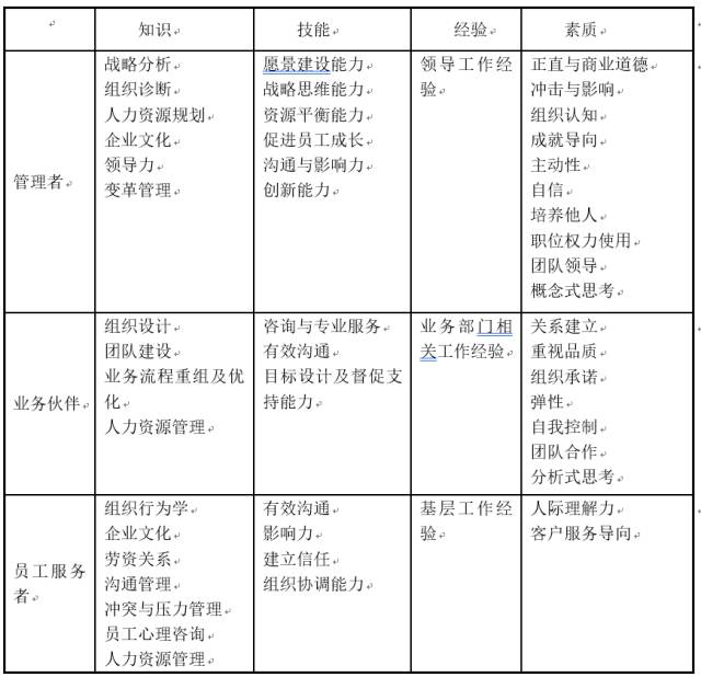 (2)企業(yè)產(chǎn)權(quán)形式不同,專業(yè)化人力資源管理者的素質(zhì)標(biāo)準(zhǔn)不同。國有企業(yè)中,人力資源管理者更多地作為管理者的身份出現(xiàn);而外資或合資企業(yè),人力資源管理者常常以專家的身份出現(xiàn),側(cè)重在業(yè)務(wù)支持和員工關(guān)系工作領(lǐng)域;民營企業(yè)的人力資源管理者,最主要的是扮演業(yè)務(wù)伙伴的角色;