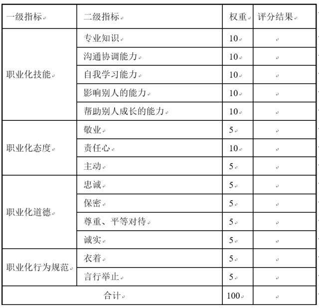 根據(jù)職業(yè)化的內(nèi)涵,我們?yōu)槠髽I(yè)的人力資源管理者初步確定了職業(yè)化技能、職業(yè)化態(tài)度、職業(yè)化道德和職業(yè)化行為規(guī)范四個(gè)一級(jí)評價(jià)維度,在此基礎(chǔ)上,開發(fā)了針對HRM的二級(jí)評價(jià)指標(biāo),并賦予了相應(yīng)的權(quán)重,如下表所示: