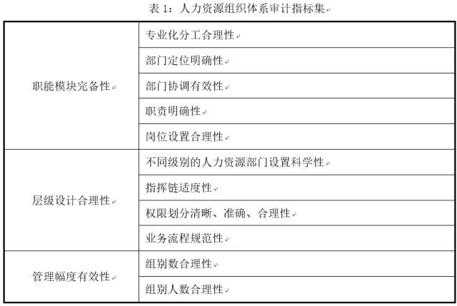每一種人力資源組織體系都是在特定的外部環(huán)境影響下產(chǎn)生的,組織形態(tài)本身并不存在優(yōu)劣之分,適合的,才是最好的。由此,從審計的角度,我們需要三個方面,一是職能模塊的完備性,二是層次設(shè)計的合理性,三是管理幅度的有效性。結(jié)合前文分析,我們建立了有關(guān)于人力資源組織體系的審計指標(biāo)集,如下表所示: