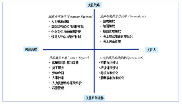 其中,部門職責(zé)是在公司戰(zhàn)略的指導(dǎo)下、基于部門角色確定的,以集團(tuán)人力資源部為例,如下圖所示,其扮演四種角色:戰(zhàn)略合作伙伴、業(yè)務(wù)職能的合作伙伴、人力資源技術(shù)提供者和行政事務(wù)專家,要扮演好不同的角色,就需要有相應(yīng)的職責(zé)進(jìn)行支撐。