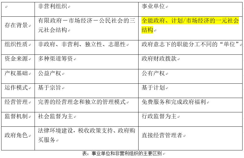 在實(shí)踐中,我國(guó)在推進(jìn)事業(yè)單位改革的過(guò)程中也逐步提出了非營(yíng)利組織的概念。試圖參照國(guó)外非營(yíng)利組織的運(yùn)作機(jī)制推動(dòng)中國(guó)事業(yè)單位的改革。要在中國(guó)事業(yè)單位改革的過(guò)程中引入非營(yíng)利組織的機(jī)制,有必要首先對(duì)二者做一個(gè)比較。