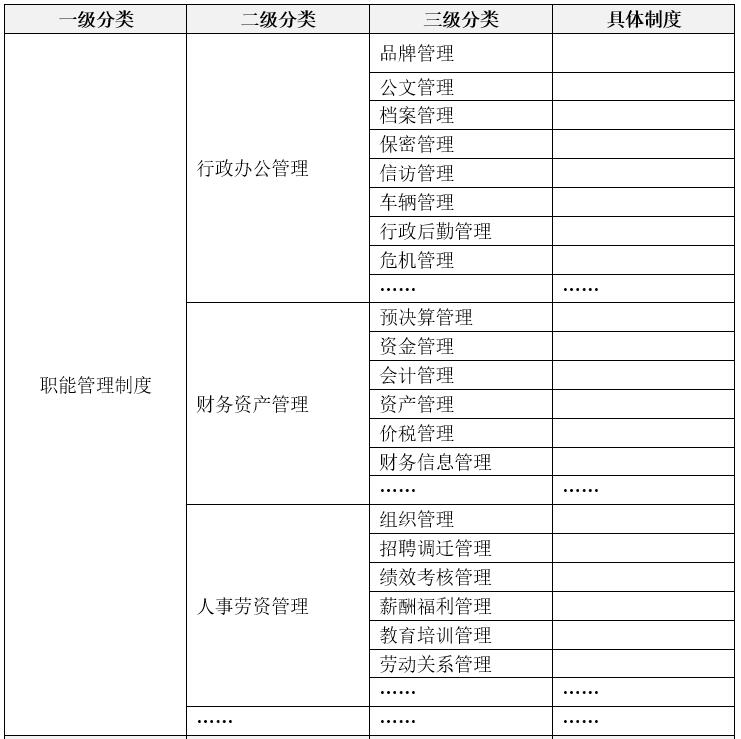 根據(jù)企業(yè)的管理職能,可以確定職能管理制度的分類,一般來講,企業(yè)的核心職能包括戰(zhàn)略管理、計劃管理、風(fēng)險管理、資產(chǎn)運營、財務(wù)管理、審計監(jiān)察、內(nèi)部控制、人力資源管理、信息資源管理、公共關(guān)系管理、基本建設(shè)管理、黨群工作、精神文明建設(shè)和企業(yè)文化建設(shè),等等。當(dāng)然,每個企業(yè)的職能不盡相同,這就需要根據(jù)職能的關(guān)鍵性、職能相關(guān)制度的數(shù)量等因素確定制度模塊的數(shù)量和名稱,力求做到無交叉、無遺漏、無重復(fù),使之涵蓋管理職能的方方面面。