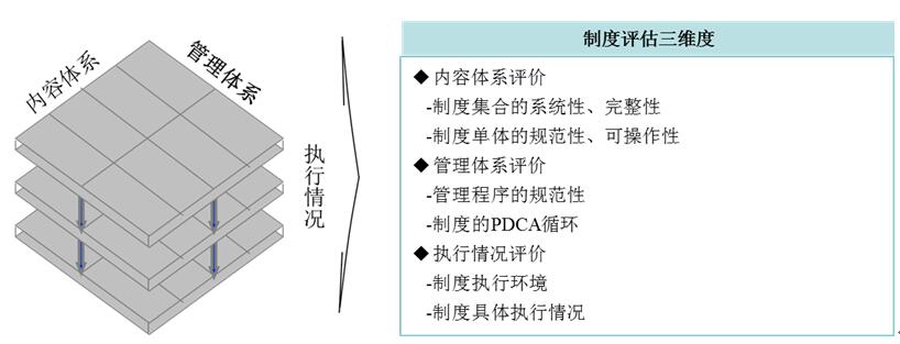 制度的核心包括內(nèi)容體系、管理體系和執(zhí)行情況三個維度,制度評估也應(yīng)與此相對應(yīng),由此我們提出了“制度評估度三維模型”,如圖所示: