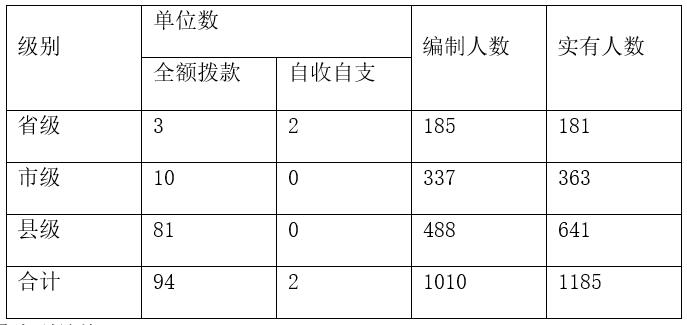 藥監(jiān)系統(tǒng)包含了省屬、市屬和縣屬事業(yè)單位。省屬事業(yè)單位共有5個,從經(jīng)費來源看,其中3個為全額撥款事業(yè)單位,2個為自收自支事業(yè)單位;市屬事業(yè)單位10個,縣屬事業(yè)單位81個,全部為全額撥款事業(yè)單位。如表所示: