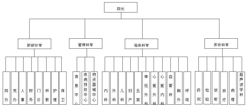 N醫(yī)院成立于1990年,是以治療心肺血管疾病為重點(diǎn)的大型綜合性醫(yī)院。醫(yī)院占地面積5萬平方米,醫(yī)療用房9萬平方米。現(xiàn)有職工近1000人,其中高級(jí)專業(yè)技術(shù)人員100余人。臨床、醫(yī)技科室15個(gè),床位500余張。具有現(xiàn)代化設(shè)施和人文理念的心胸血管外科大樓,具有百、萬級(jí)凈化層流手術(shù)室20間,術(shù)后監(jiān)護(hù)病床30張,新建的門診綜合樓2.8萬平方米,為患者提供的人性化醫(yī)療服務(wù)。心臟外科、心臟內(nèi)科、血管科、胸外科、呼吸內(nèi)科是醫(yī)院的重點(diǎn)特色科室,醫(yī)院的組織結(jié)構(gòu)圖如下: