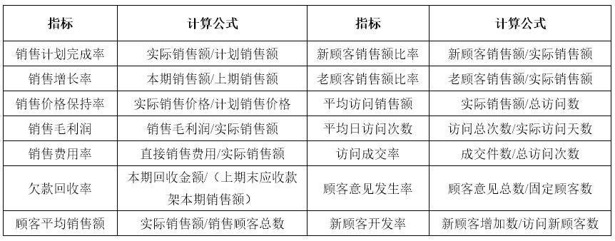 銷(xiāo)售績(jī)效分析主要分析銷(xiāo)售計(jì)劃完成率、地區(qū)發(fā)展?fàn)顩r以及銷(xiāo)售活動(dòng)效率等內(nèi)容,主要指標(biāo)及計(jì)算公式如表1所示。