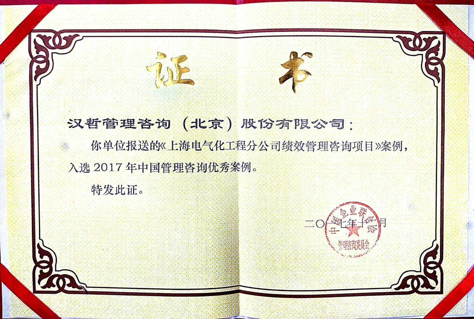 近日接到通知,由漢哲管理咨詢(北京)股份有限公司完成的中鐵電氣化局上海分公司績(jī)效管理咨詢項(xiàng)目,獲得中國(guó)管理咨詢主管機(jī)構(gòu)-中國(guó)企業(yè)聯(lián)合會(huì)管理咨詢委員會(huì)評(píng)選的“2017年中國(guó)管理咨詢優(yōu)秀案例”。